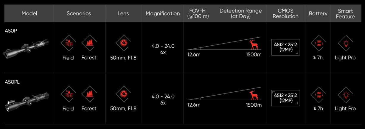 Jedną z najważniejszych cech modelu HIKMICRO Alpex Pro LRF A50PL jest wysokiej klasy sensor CMOS o bardzo dużej rozdzielczości. Dzięki niemu urządzenie oferuje wyjątkowo szczegółowy obraz oraz bardzo dobrą czułość na światło. W rezultacie celownik noktowizyjny HIKMICRO Alpex Pro LRF A50PL pozwala na łatwą identyfikację obiektów nawet na większych dystansach.