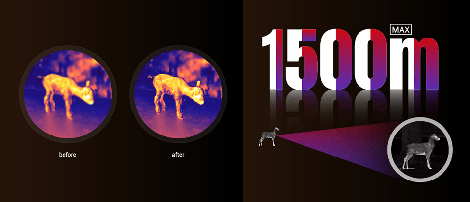 Wysokiej jakości obrazowanie termiczne o rozdzielczości 640×512@12μm pozwala na lepsze rozpoznawanie zwierząt, ich części ciała, a nawet drobnych elementów, takich jak gałęzie, liście, trawa i krajobraz.