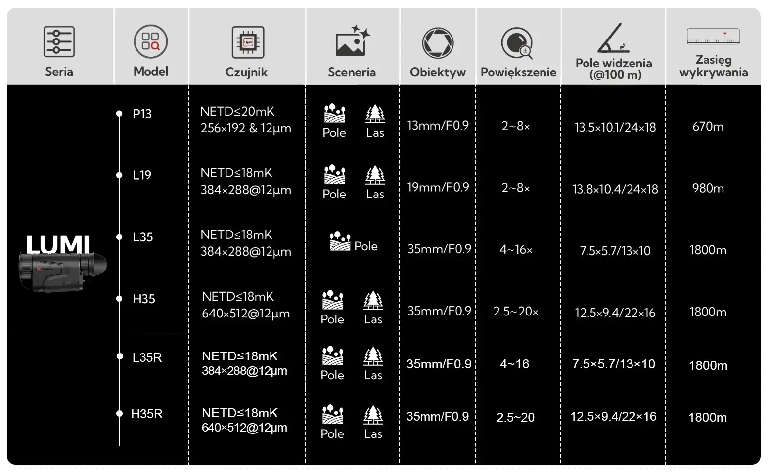 | Pole widzenia (H×V), °/m@100m | 7.5x5.7 / 13x10 |