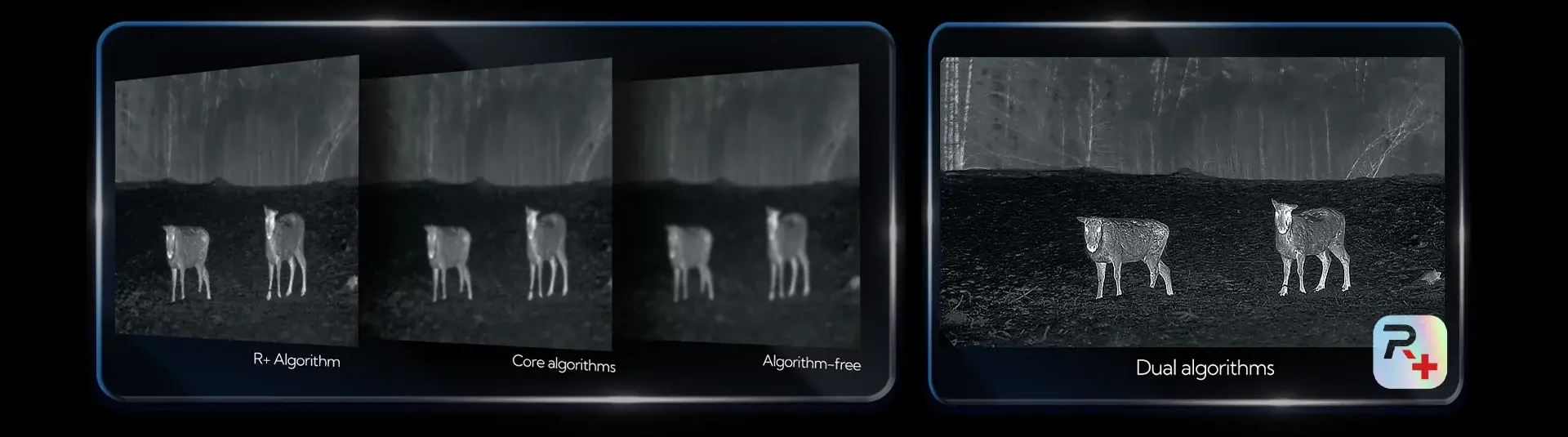 Dzięki podwójnym algorytmom - nowoczesnemu silnikowi przetwarzania obrazu i inteligentnej technologii R+, która dostosowuje się do powiększenia lunety - Nocpix MATE Lite zachowuje ostrość i szczegółowość nawet we mgle, deszczu czy przy słabym świetle.